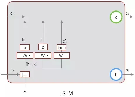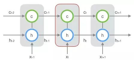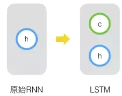 其实,长短时记忆网络的思路比较简单。原始RNN的隐藏层只有一个状态,即h,它对于短期的输入非常敏感。那么,假如我们再增加一个状态,即c,让它来保存长期的状态,那么问题不就解决了么?如下图所示: