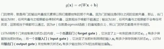 前面描述的开关是怎样在算法中实现的呢?这就用到了门(gate)的概念。门实际上就是一层全连接层,它的输入是一个向量,输出是一个0到1之间的实数向量。假设W是门的权重向量,是偏置项,那么门可以表示为: