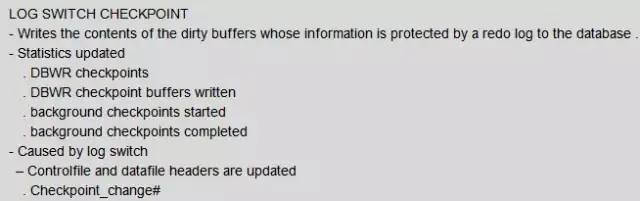 日志切换之后,有一个“日志切换检查点”操作,这个操作由CKPT发起,让DBWR进程把缓冲区的脏数据写入磁盘,之后才会把redo logfile的状态从ACTIVE变成INACTIVE。