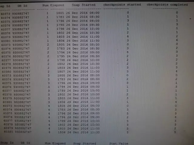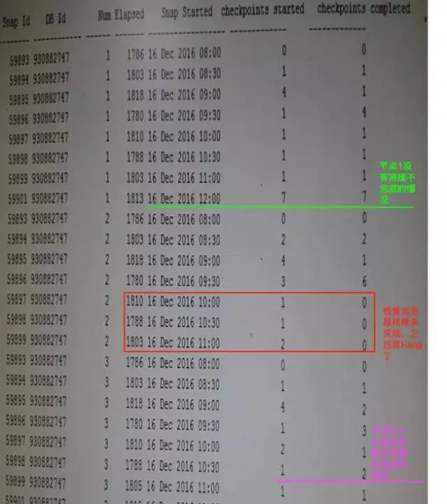 前面提到过,日志切换检查点会更新系统状态信息(background checkpoints started和background checkpoints completed),从DBA_his_sysstat历史表中得到了下列信息,节点2后台检查点完成信息从10点开始到11点一直没有更新,而其他节点的检查点进程完成更新很及时。