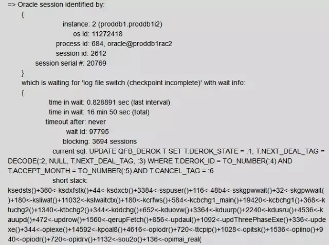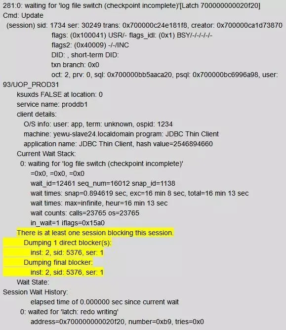 DML语句:Update,然后它们的阻塞会话在等待log file switch(checkpoint incomplete)。