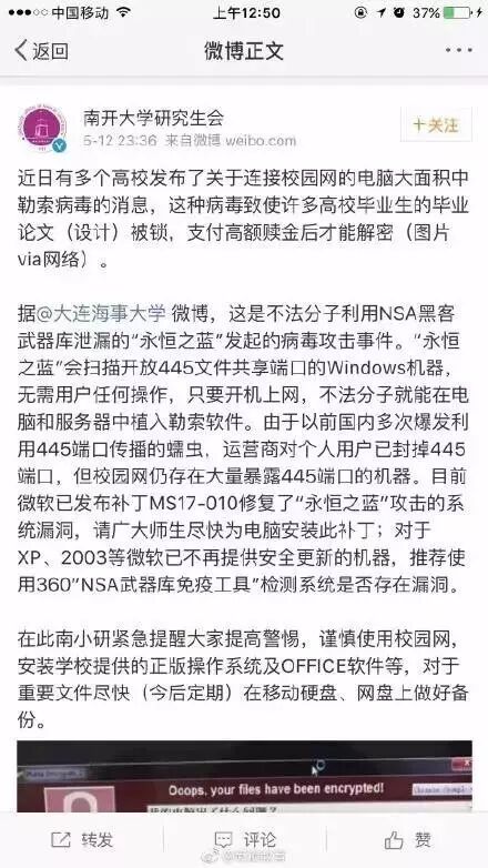 阿里云安全专家分析,此次勒索事件在校园网传播速度之快,影响面之大主要原因是当前大部分学校基本是一个大的内网互通的局域网,不同的业务未划分安全区域。例如:学生管理系统、教务系统等都可以通过任何一台连入的设备访问,