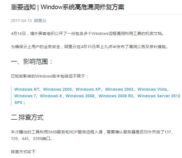 此前,阿里云第一时间发布预警,并推出一键检测修复NSA黑客武器攻击漏洞的工具。