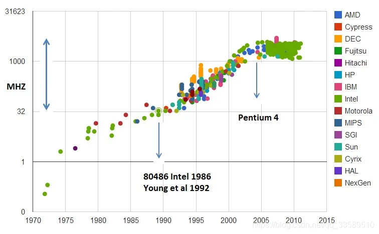 - 从1978年Intel发布的8086 CPU开始,计算机的主频从5MHz开始,不断攀升