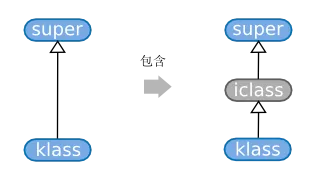 include模块,本质上是在对象或者类的klass和super之间插入了一个代理类iclass,这个代理类的方法表(m_table)和变量表(iv_table)分别指向了被包含的模块的方法表和变量表(通过指针,因此当包含的Module变化的时候,对象或者类也能相应变化),那么在查找类或者对象的class的时候,上面已经说明将忽略这些代理类。