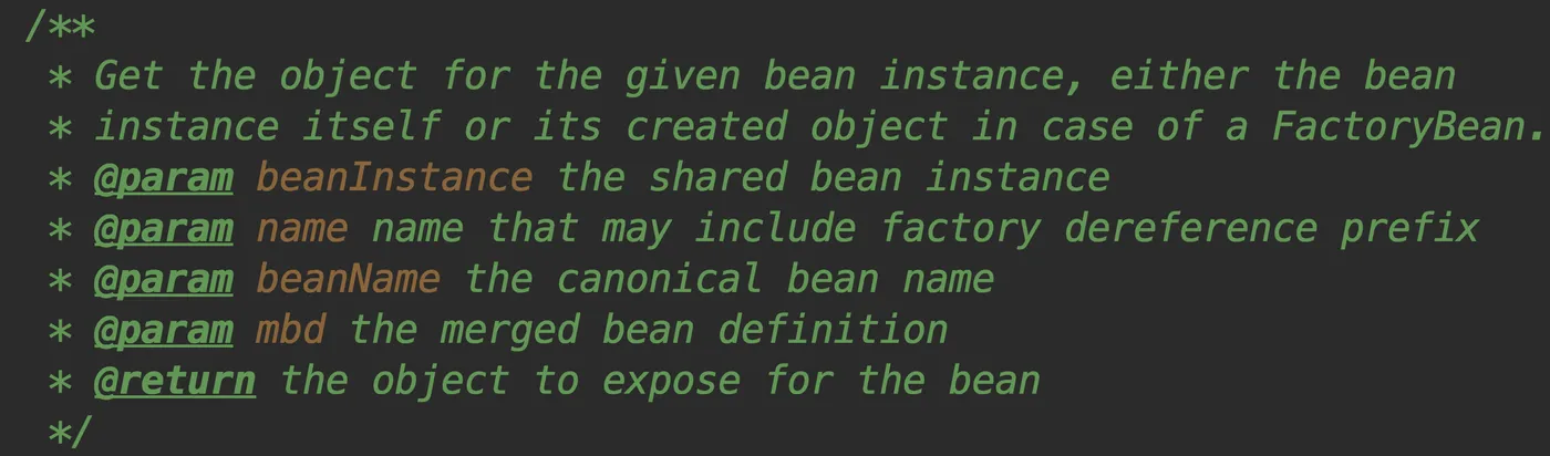 if (sharedInstance != null && args == null) { ... //以取得 FactoryBean 的相关处理及生产结果 bean = getObjectForBeanInstance(sharedInstance, name, beanName, null); }