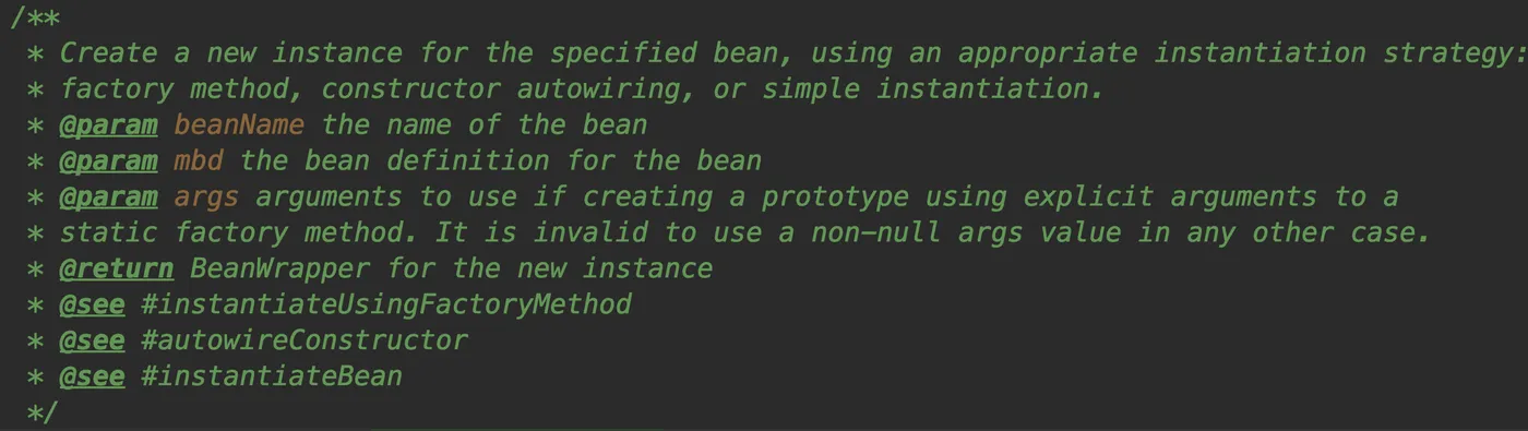 /** * 返回指定 Bean 的一个实例,该实例可以是共享的,也可以是单例 */ public <T> T getBean(String name, @Nullable Class<T> requiredType, @Nullable Object... args) throws BeansException { // 这些 getBean 接口最终都是通过调用 doGetBean 实现 return doGetBean(name, requiredType, args, false); }