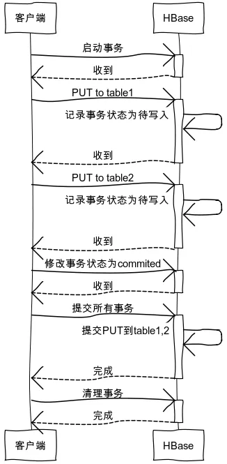 客户端对多张表更新时,先启动事务,然后每次PUT,将事务id传递给HRegionServer。