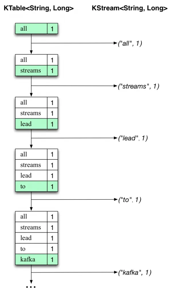 “all stream lead to kafka”这行文本先被处理。随着每一个新单词作为一个表格中的新项(绿色背景高亮显示)加入到KTable,KTable表格逐渐增长,同时相应的变化记录被发送到下面的KStream中。