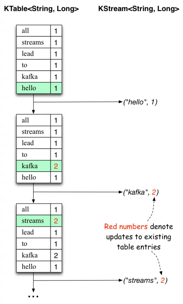 下面的两幅图展示了这个场景下到底发生了什么。图上的第一列展示了计算单词出现次数的KTable<String, Long>的当前状态演化。第二列展示了状态更新导致的KTable变化记录,也是被发送到Kafka输出主题streams-wordcount-output中的数据。