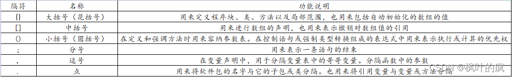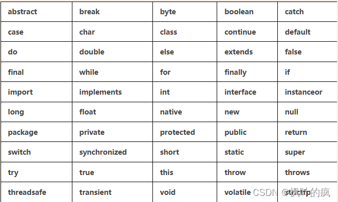 - 保留字是java预留的关键字,他们虽然现在没有作为关键字,但在以后的升级版本中有可能作为关键字。所以我们在等一标识符的时候,不能与它们冲突,否则代码不能正常执行。