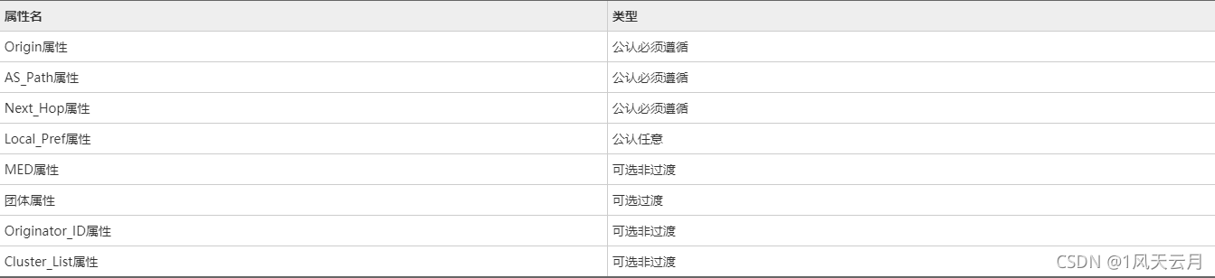- 可选非过渡(Optional non-transitive):BGP设备可以不识别此类属性,如果BGP设备不识别此类属性,则会被忽略该属性,且不会通告给其他对等体