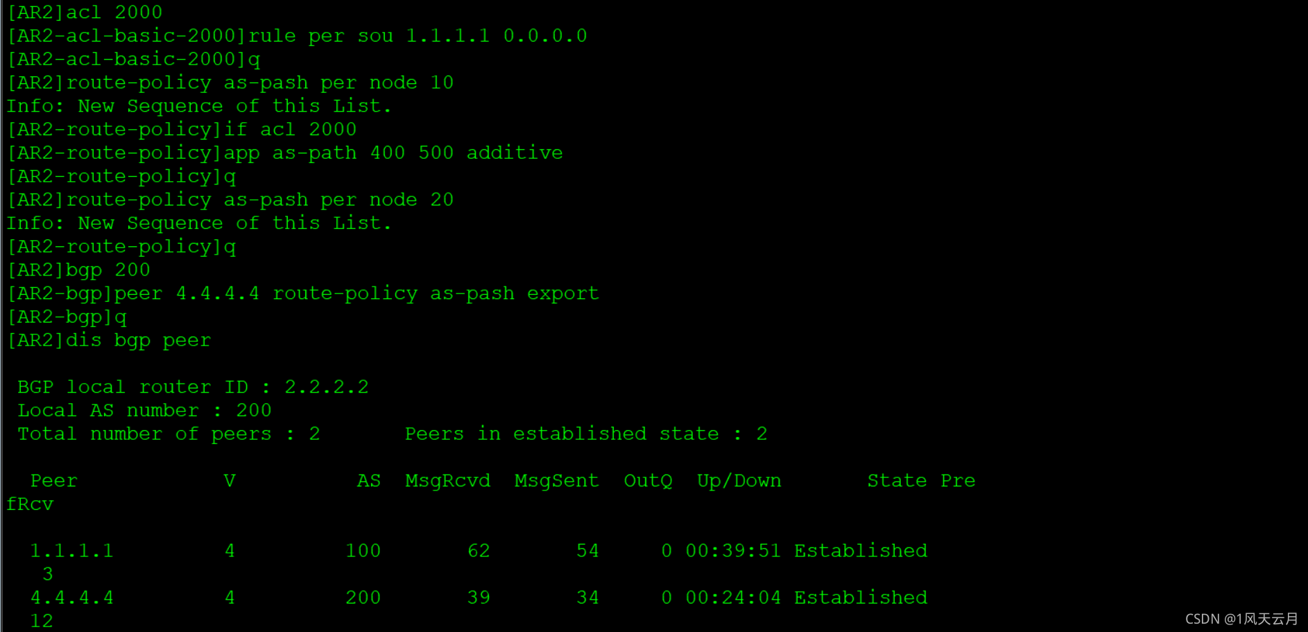 - 当BGP Speaker将这条路由通告给EBGP对等体时,便会把本地AS编号添加在AS_Path列表的最前面(最左面),收到此路由的BGP设备根据AS_Path属性就可以知道去目的地址所要经过的AS,离本地AS最近的相邻AS号排在前面,其他AS号按顺序依次排列