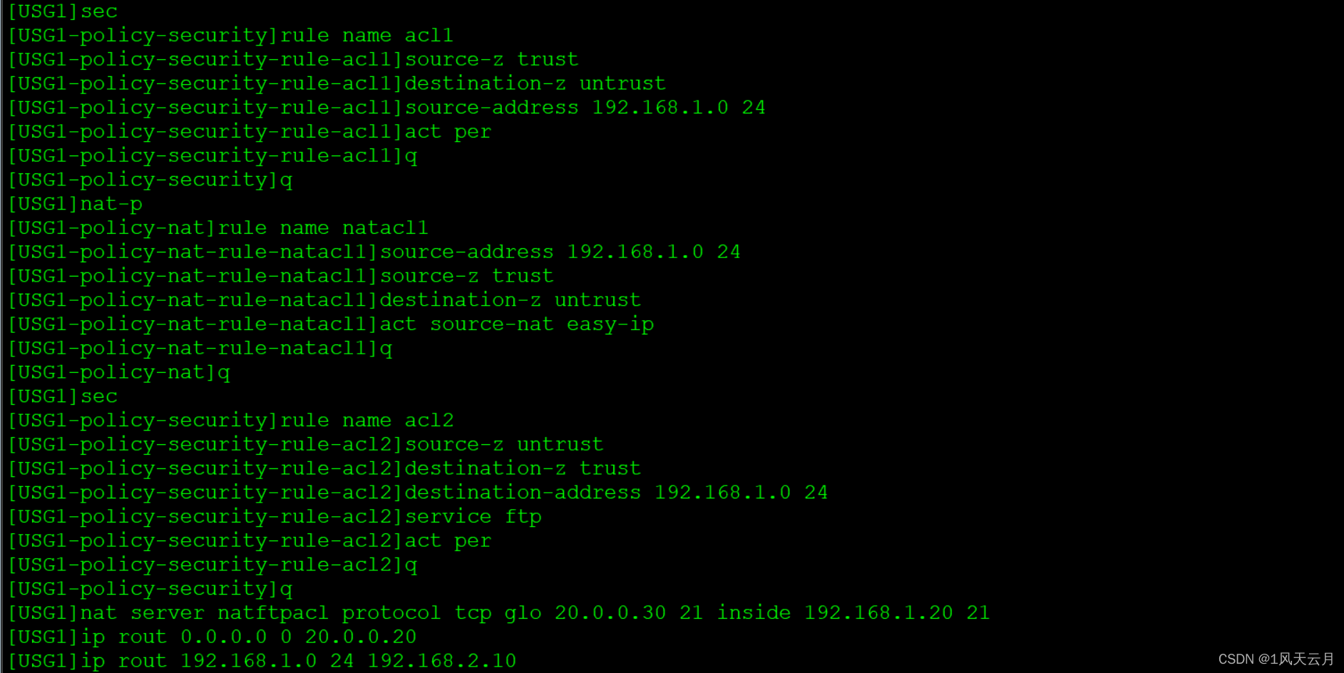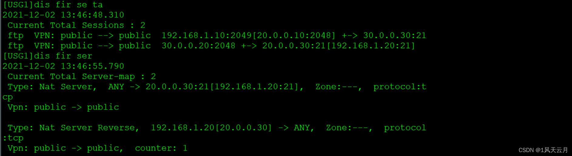 - 当NAT地址池地址与出接口地址一致时,华为防火墙收到公网用户的报文后,发现是访问自身的报文,这时候取决于出接口所属安全区域和Local安全区域之间的安全策略,安全策略允许通过,就处理,安全策略不允许通过,就丢弃,不会产生路由环路,也不需配置黑洞路由