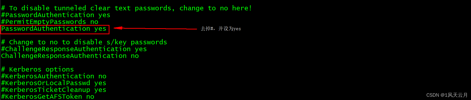 去掉PasswordAuthentication前边的#号,将后面修改为yes