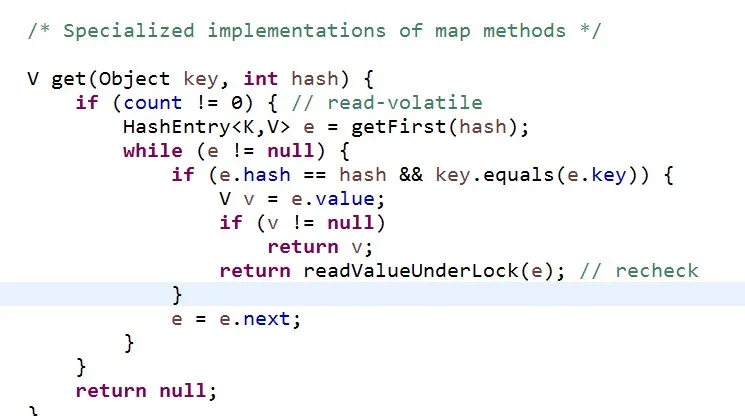 不得不赞叹,作者深厚的功底啊,当执行读的时候,先判断count,count就是一个Segment(充当锁的角色)所守护HashEntry的数量。