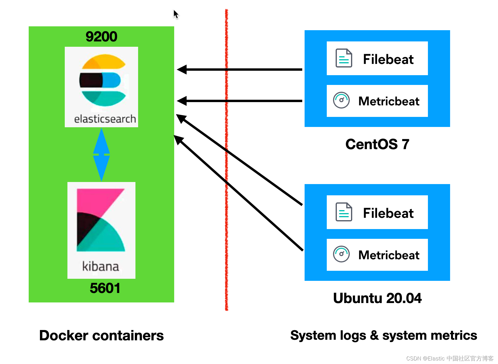如上所示,我们将在左边使用 Docker 来安装 Elasticsearch 及 Kibana。在右边的两个虚拟机中,我们将分别安装 centos 7 及 Ubuntu 20.04。我们分别在这两个系统中安装相应的 Filebeat 及 Metricbeat 来收集系统日志及指标,并发送至 Elasticsearch 进行存储及分析。我们可以使用 Kibana 来对收集的数据进行可视化及分析。