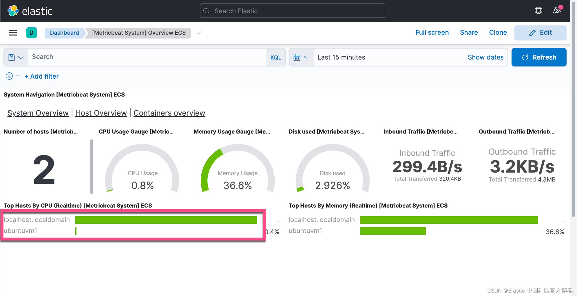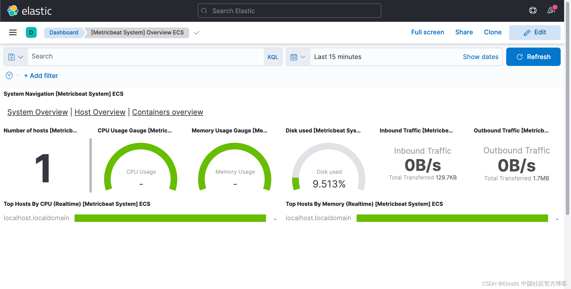 我们可以打开 Metricbeat 的 Dashboard 来查看 Metricbeat 所收集上来的指标: