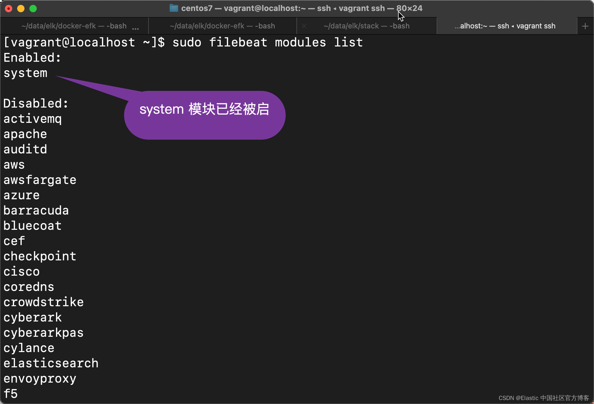 [vagrant@localhost ~]$ sudo filebeat modules enable system Enabled system
