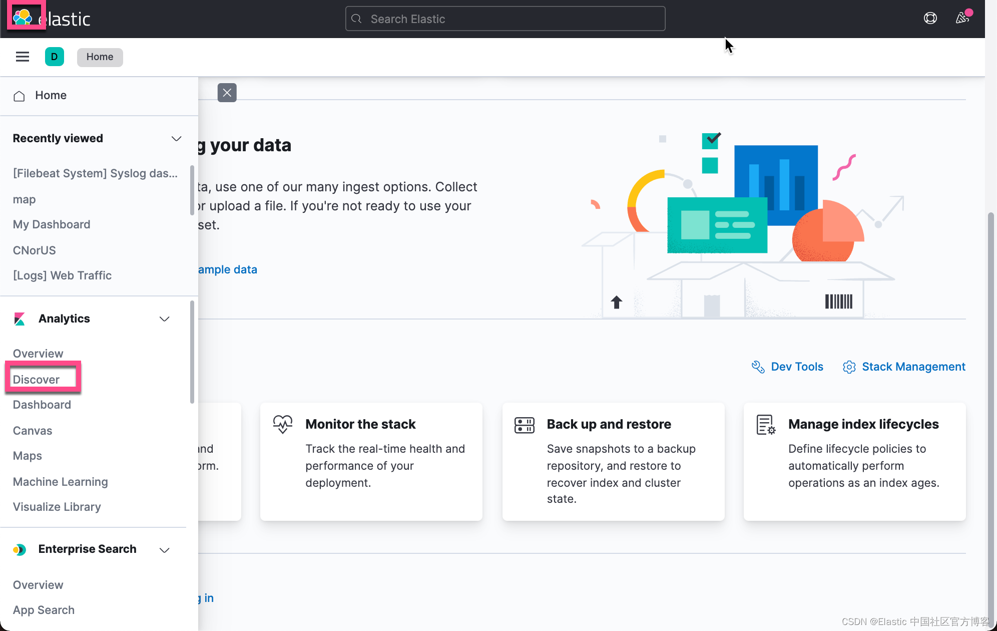 我们首先来安装 Metricbeat。它的安装步骤和 Filebeat 基本相似。打开 Kibana: