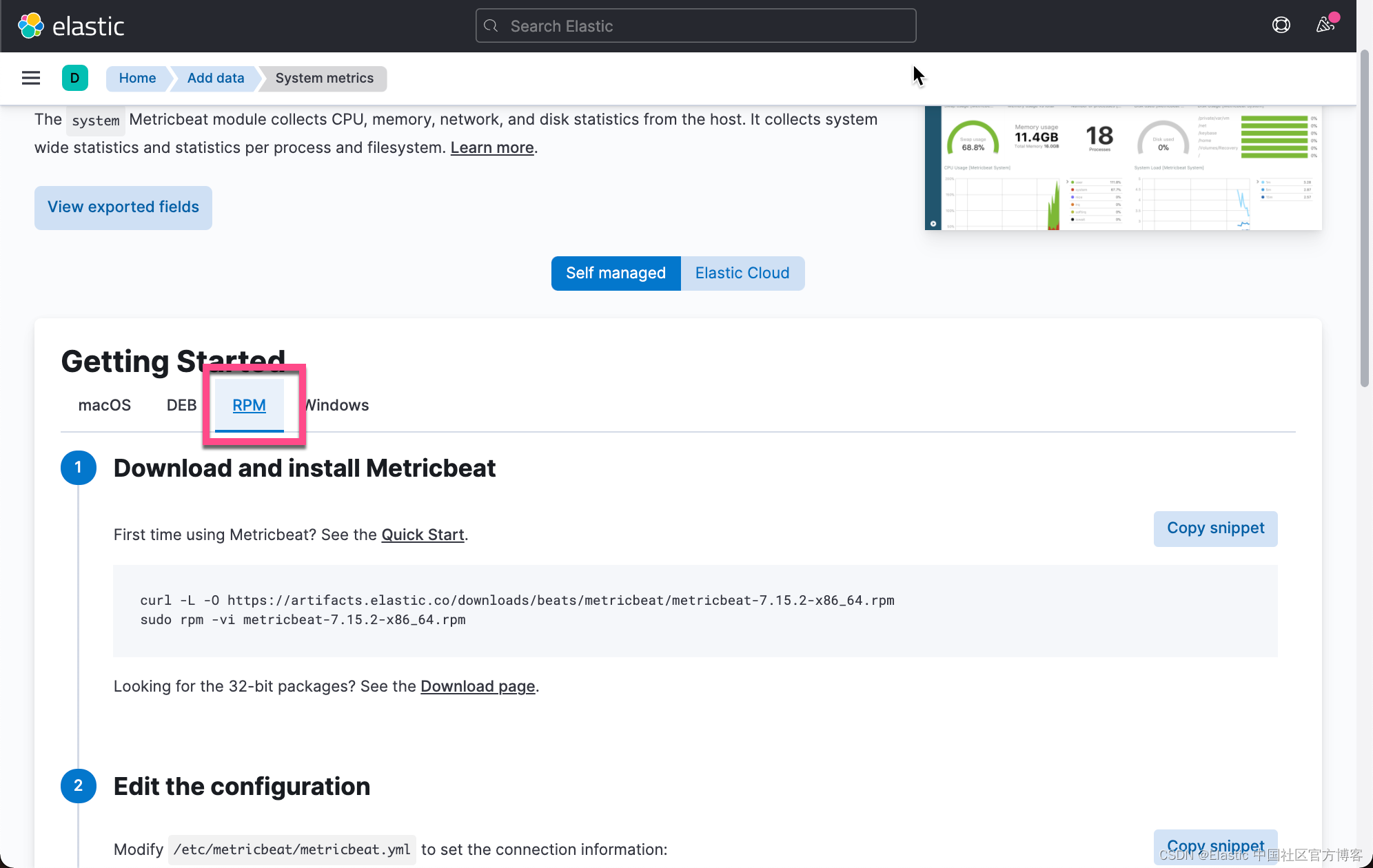 如上所示,我们选择 RPM,并按照上面的指令来安装 Metricbeat: