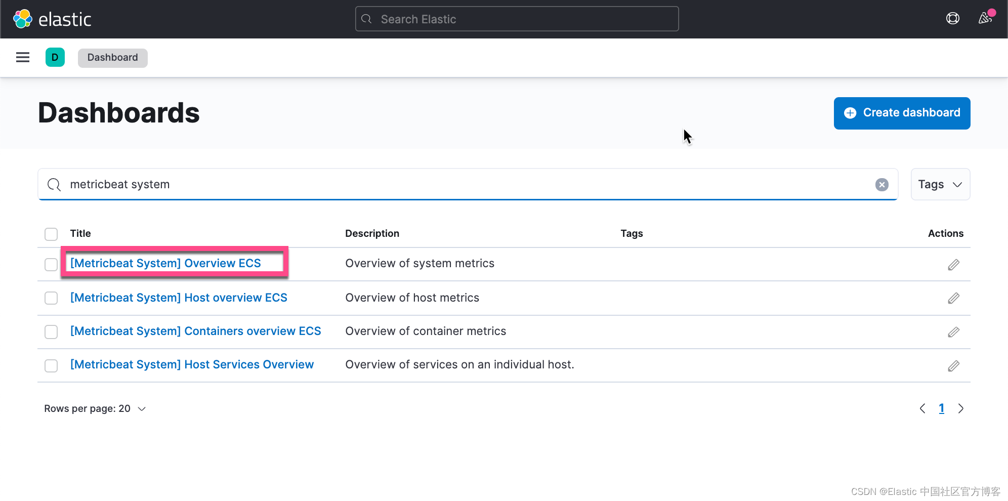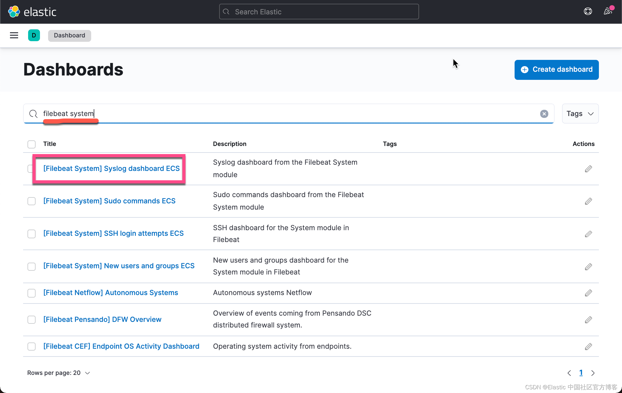 执行完这个指令后,我们可以在 Kibana 的 Dashboard 里看到已经生成的 Dashboard: