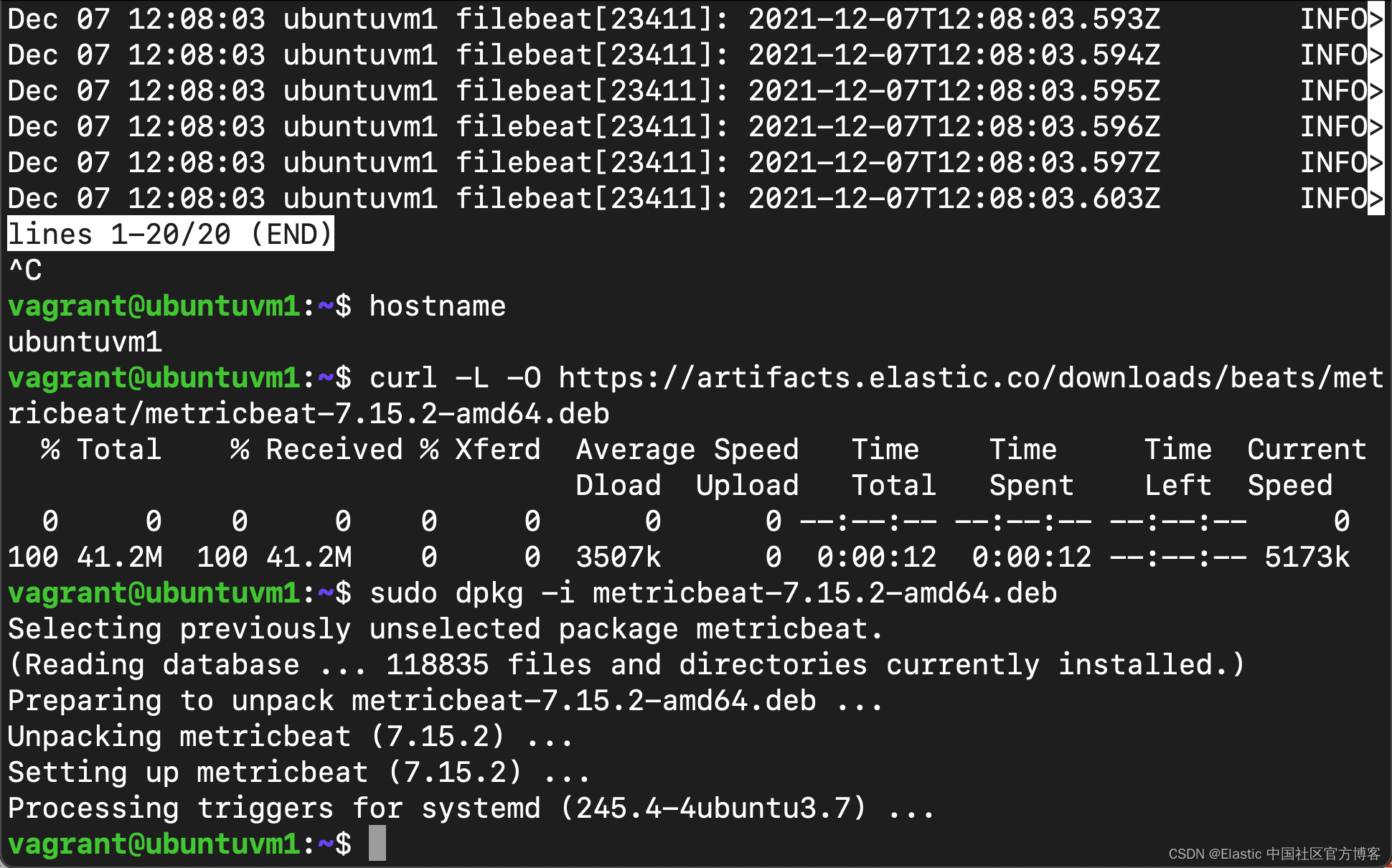 [vagrant@localhost ~]$ curl -L -O https://artifacts.elastic.co/downloads/beats/metricbeat/metricbeat-7.15.2-x86_64.rpm % Total % Received % Xferd Average Speed Time Time Time Current Dload Upload Total Spent Left Speed 0 40.8M 0 76405 0 0 176k 0 0:03:57 --:--:-- 0:03:57 176k 100 40.8M 100 40.8M 0 0 32.3M 0 0:00:01 0:00:01 --:--:-- 32.3M [vagrant@localhost ~]$ sudo rpm -vi metricbeat-7.15.2-x86_64.rpm warning: metricbeat-7.15.2-x86_64.rpm: Header V4 RSA/SHA512 Signature, key ID d88e42b4: NOKEY Preparing packages... metricbeat-7.15.2-1.x86_64
