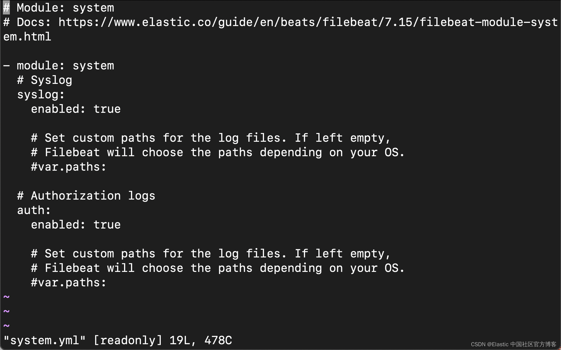 其它所有的模块都是被禁止的。事实上,system.yml 文件就是针对 system log 进行的配置。通常它会自动根据系统的不同获取当前系统的日志的位置及文件: