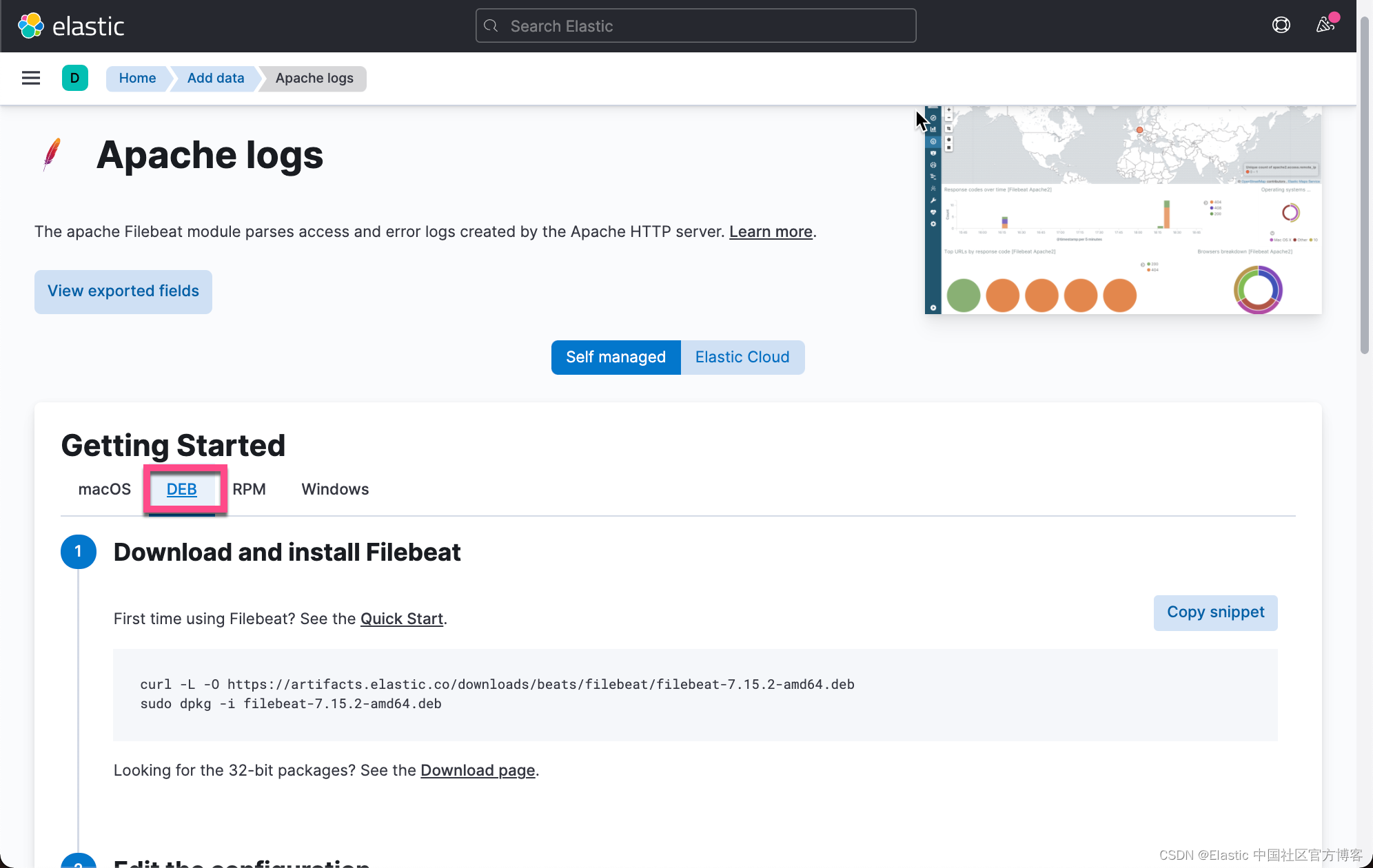 由于一些原因,在最新的 7.15.2 的发布中,我在上面的界面中并没有看到 System logs 的选项。我不能确定这是否一个 bug。也许推荐的办法是使用 Elastic Agent 来对 System logs 进行采集。尽管如此,我们可以选择任何 Apache logs 来查看安装说明,这是因为对于它们来说安装 Filebeat 的指令是一样的,只是启动的模块不同而已。我们点击上面的 Apache logs: