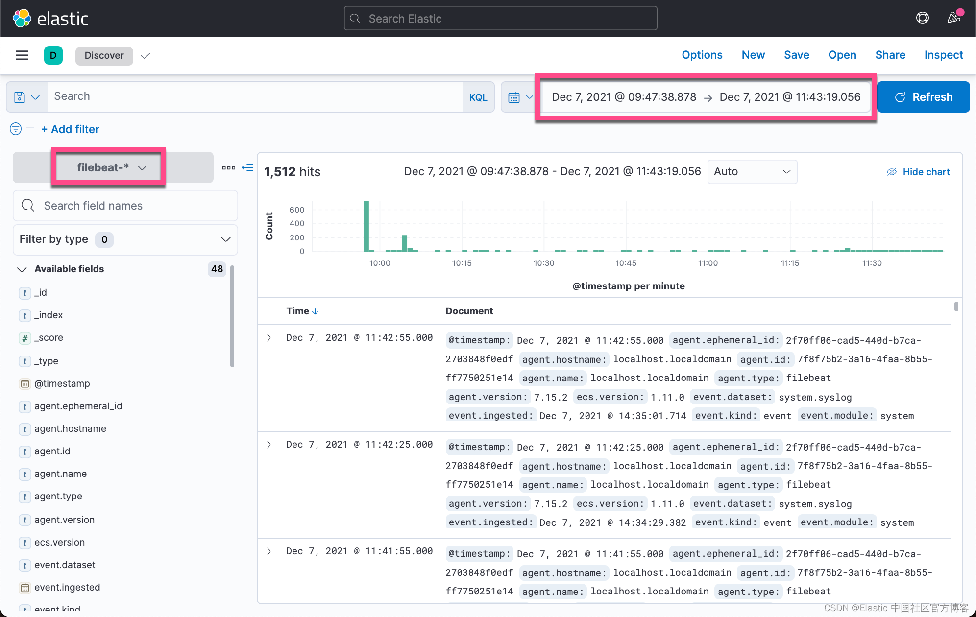 我们在 Kibana 的 Discover 中来查看收集上来的 Filebeat 日志: