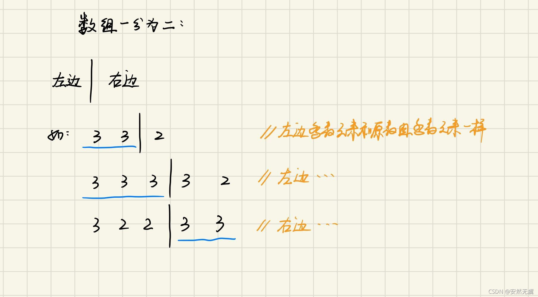 其实用分治法解决本题,多数元素就是数组一分为二...分完之后,每次分完都至少有一半的小数组的多数元素和原数组的多数元素是一样的。如下: