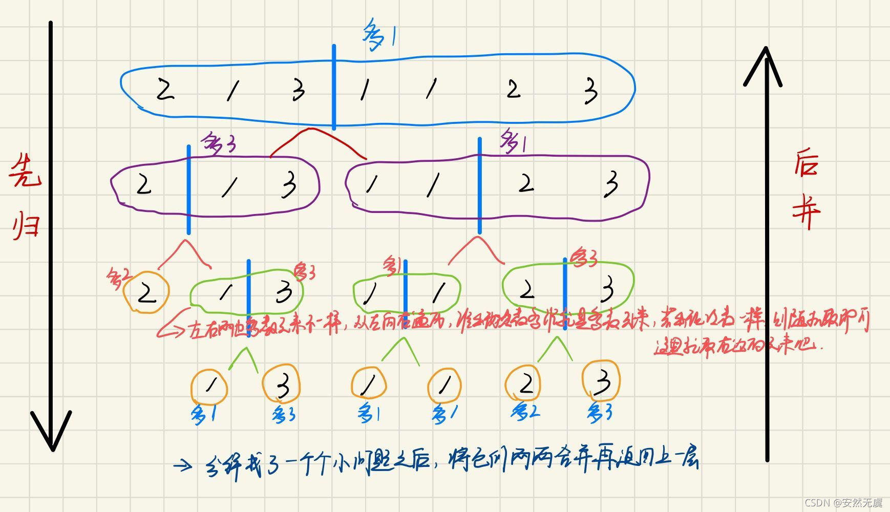 #define N 100 void sortArray(int* nums, int left, int right) { int tmp[N] = { 0 };//tmp作为辅助数组 //子问题不能接着分解了 if (left >= right) return; //分解子问题,并且递归处理 int mid = (left + right) >> 1; sortArray(nums, left, mid); sortArray(nums, mid + 1, right); //合并子问题 int k = 0; int i = left; int j = mid + 1; while (i <= mid && j <= right) { if (nums[i] <= nums[j]) { tmp[k++] = nums[i++]; } else { tmp[k++] = nums[j++]; } } //左半部分有剩余 while (i <= mid) { tmp[k++] = nums[i++]; } //右半部分有剩余 while (j <= right) { tmp[k++] = nums[j++]; } }