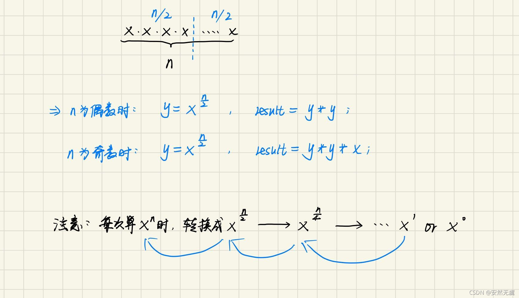int pow(int x, int n) { int sum = 0; //找边界 if (n == 0) { return 1; } if (n == 1) { return x; } //n为奇数 if (n & 1) { sum = pow(x, n / 2) * pow(x, n / 2) * x; } //n为偶数 else { sum = pow(x, n / 2) * pow(x, n / 2); } return sum; }