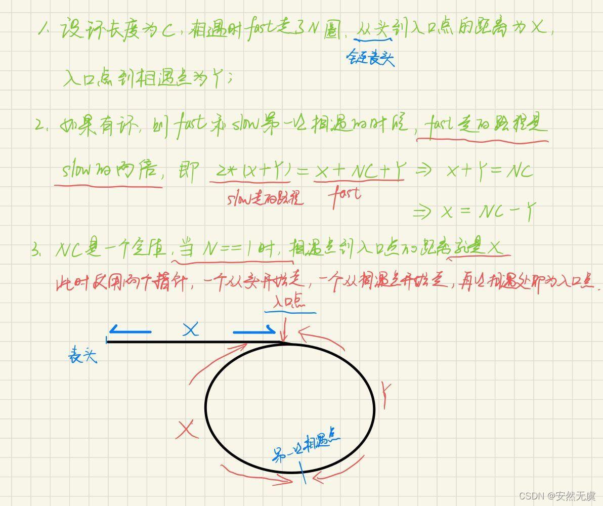 /** * Definition for singly-linked list. * struct ListNode { * int val; * struct ListNode *next; * }; */ struct ListNode *detectCycle(struct ListNode *head) { struct ListNode* slow = head; struct ListNode* fast = head; //如果链表无环,跳出循环一定是fast == NULL || fast->next == NULL while(fast && fast->next)//先找第一次相遇点 { slow = slow->next; fast = fast->next->next; if(slow == fast) { break; } } //链表无环时的情况,如果有环,一定不会有NULL //注意哦,不是head == NULL || head->next != NULL if(fast == NULL || fast->next == NULL) { return NULL; } //相遇后即有环,此时使用两个指针,一个从头开始走 //一个从相遇点开始走,两者再次相遇处即为入口点 slow = head; while(slow != fast) { slow = slow->next; fast = fast->next; } return slow; }
