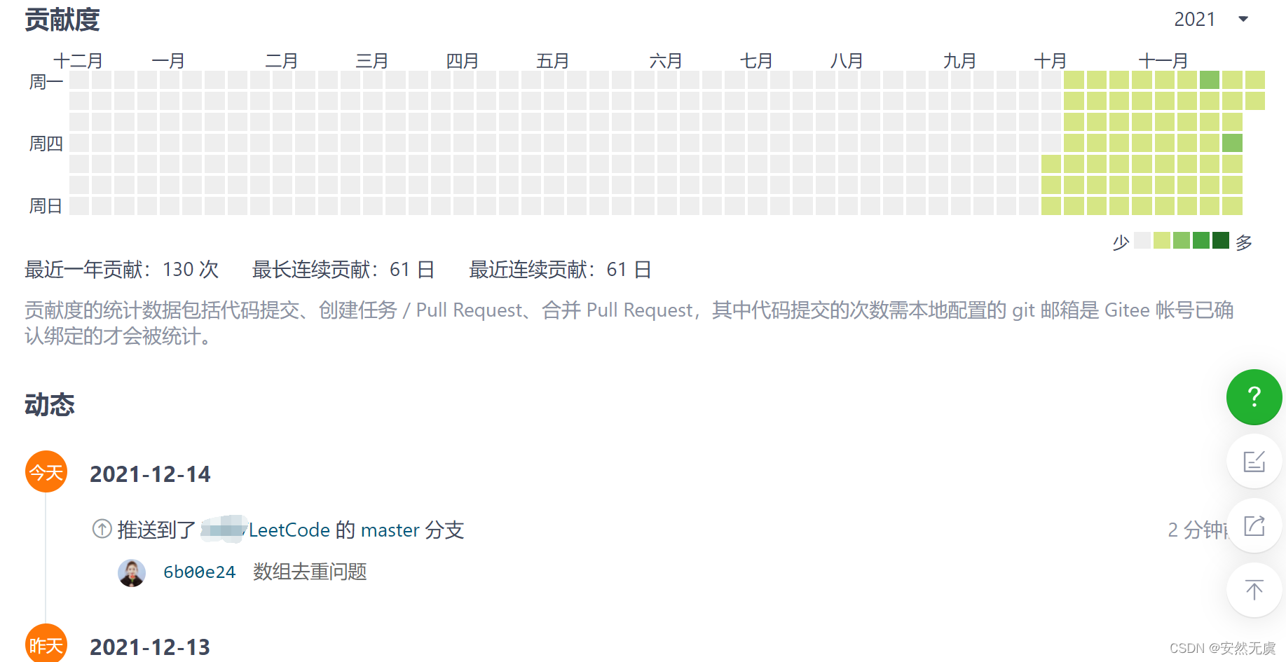 因为是自己给自己安排的任务,没有人监督,所以很明显,中间有几天是断着的,但是现在不会咯,因为鸭,刷题已经成为了一种习惯,就像是上传代码到gitee一样,一天不做这件事就觉得少了点什么,哈哈。