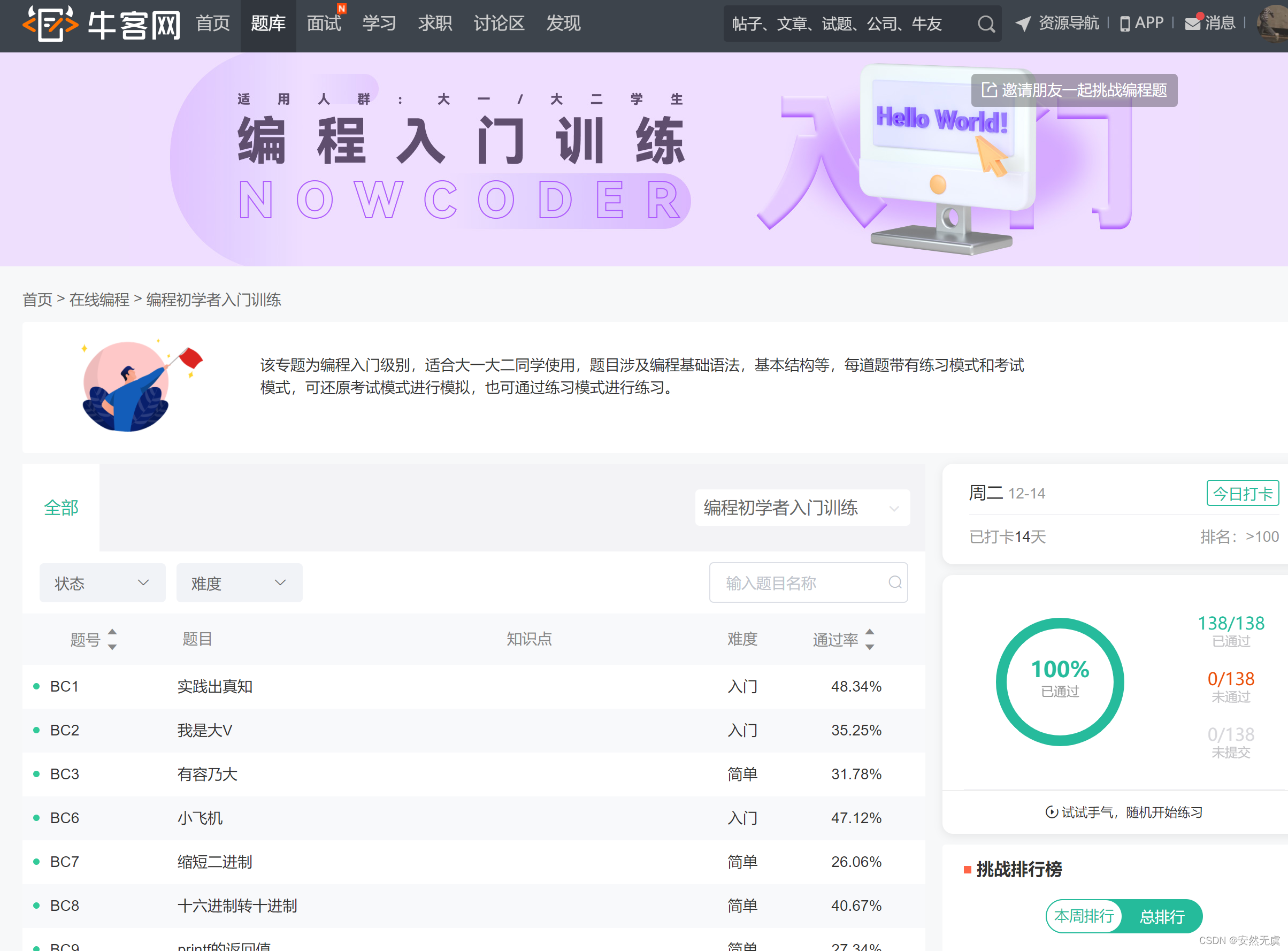 C语言基础知识学习完了,你以为就没了,远远不够呢,此时的你急需大量练习,正好这里有牛客网的138道编程初学者练习,这是C语言基础语法部分学完就可以上手的题目,灰常好!