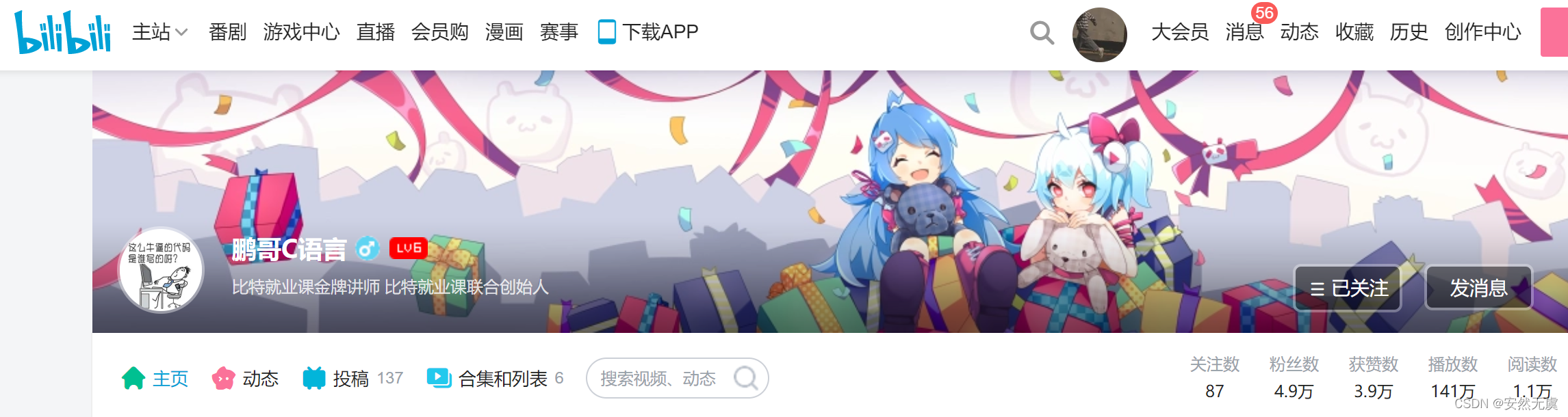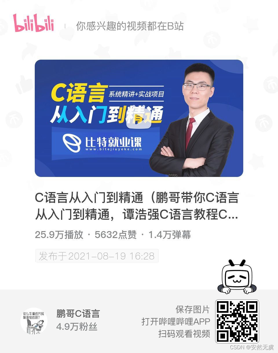 大一下,我接触了一门真正有意义的专业课——C语言,前一个月跟着老师敲,但是不知道个所以然,问老师问题时突然认识到自己很多基础概念都不知道。当时心里就想:挖草,完蛋了,这样下去我怎么找工作啊!之后我就在B站上面疯狂找一些C语言学习视频,以及计算机专业应该怎么度过大学四年这类视频,前前后后找了差不多一个星期(因为找到了一个学习资源之后要试听几节课,看看这个老师讲的怎么样,是否对自己的胃口等等问题),最终,皇天不负有心人,我遇到了鹏哥!这个风一般的男子!教的是真好!(相见恨晚呐,还好不算太晚)我真的是爱死他了(哈哈,此爱非彼爱)。