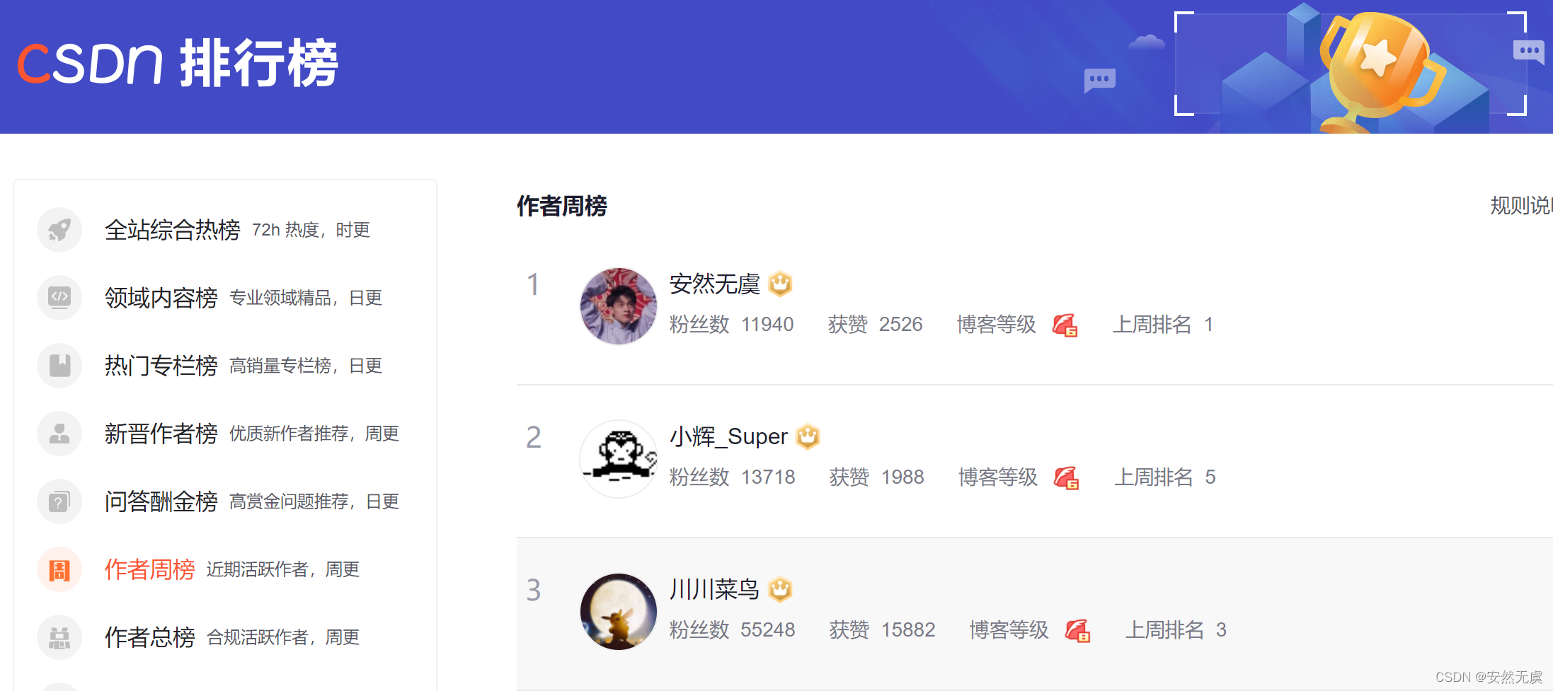 目前已经连续两周周榜排名第一咯,嘿嘿,向大佬们学习,一起加油!