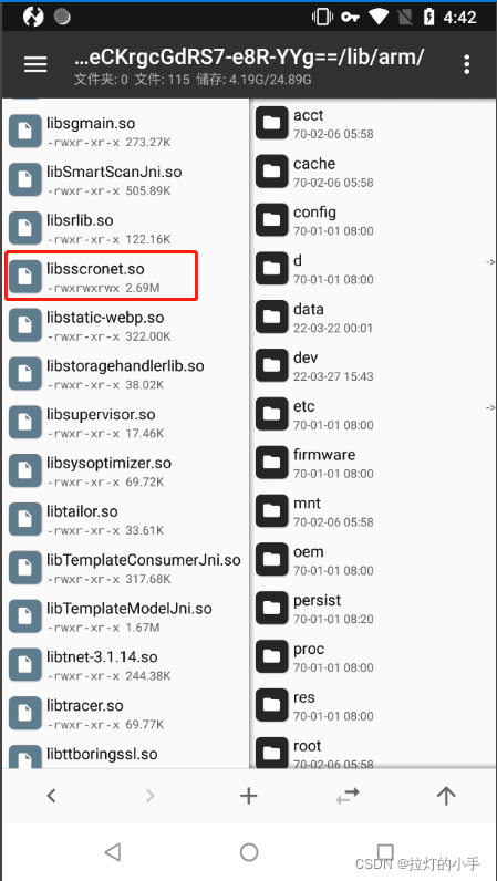 然后把修改过的so复制到你的安卓手机上,这种方案,不限制安卓版本,手机必须ROOT,因为我们要替换lib下面的libsscronet.so将libsscronet.so文件移动至/data/app/com.ss.android.ugc.aweme-EideCKrgcGdRS7-e8R-YYg==/lib/arm/下并修改权限为777