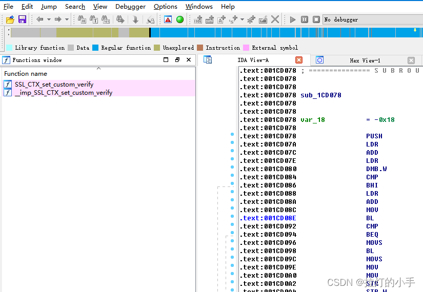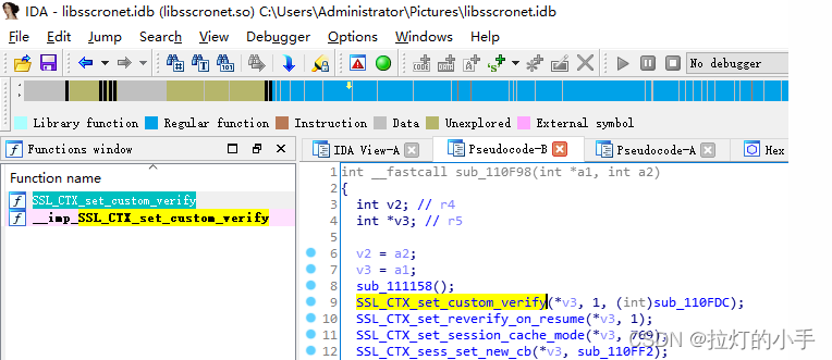 打开libsscronet.so 然后根据关键字"SSL_CTX_set_custom_verify"查找定位到效验证书的方法看返回值是1,经过反复调试,发现只有当他返回值为0的时候才可以过ssl,所以我们把他改成0 然后这种点位一共有3个 ,全部保存为0 然后ctrl+s 保存一下。