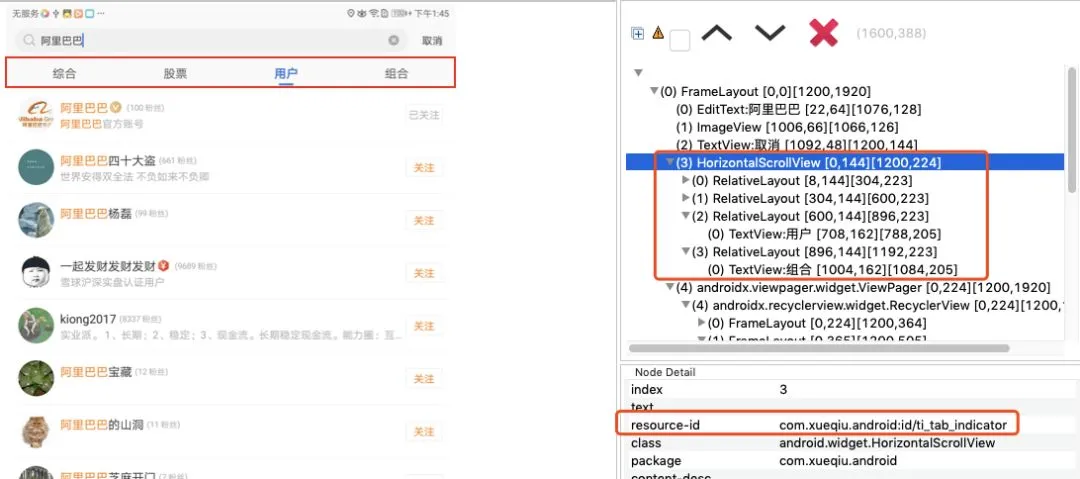 2)接着我们就必须从 tag 页内部来找标志控件了,我们发现在“股票”和“用户”页中搜索出来的结果名称的 id 是不同的: