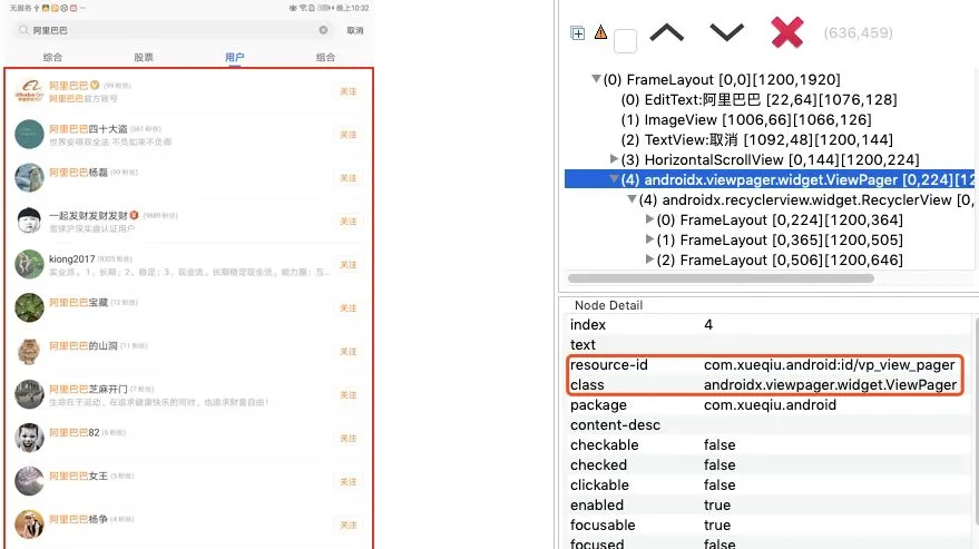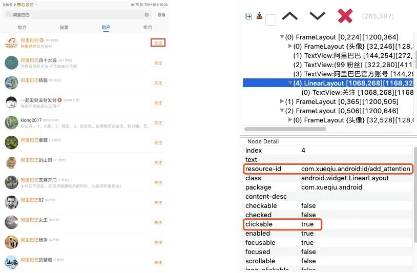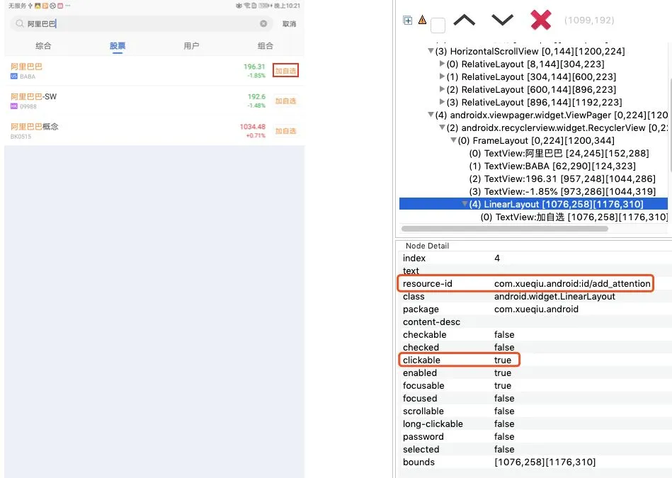 在“股票”和“用户”tag页中,“加自选”和“关注”控件的clickable及id属性一样。