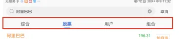 - 在页面中有很多标签页(例如综合、股票、用户、组合):