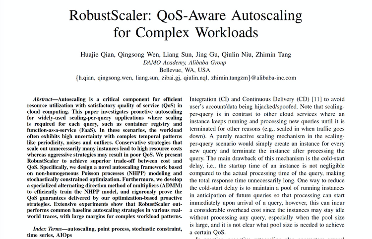 近日,阿里云容器服务团队与达摩院数据决策团队合作的论文《RobustScaler: QoS-Aware Autoscaling for Complex Workloads》被数据管理与数据库国际顶级会议 ICDE 2022 长文录用。ICDE 和 SIGMOD、VLDB 并称为数据库领域的三大国际顶尖学术会议,入选中国计算机学会(CCF)推荐 A 类国际会议列表。