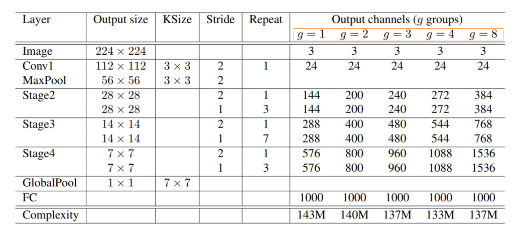 下图网络结构的每一步变化也较好分析,不会的可以参考我之前的博客。需要注意的是黄框框住的g表示不同的分组数,如g=3表示将特征图分成3组进行分组卷积。