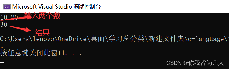 //写一个代码,计算两个整数的和 //printf是一个输出函数 //scanf是一个输入函数 #include<stdio.h> int main() { int num1 = 0; //建议初始化定义为0 int num2;//初始化 //输入两个整数 scanf("%d %d", &num1, &num2); //求和 int sum = num1 + num2; //输出 printf("%d\n", sum); return 0; }