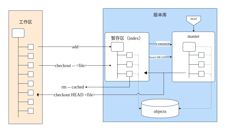 - 当对工作区修改(或新增)的文件执行 git add 命令时,暂存区的目录树被更新,同时工作区修改(或新增)的文件内容被写入到对象库中的一个新的对象中,而该对象的ID被记录在暂存区的文件索引中。