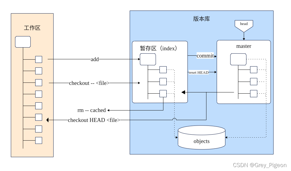 - 图中的 objects 标识的区域为 Git 的对象库,实际位于 ".git/objects" 目录下,里面包含了创建的各种对象及内容。