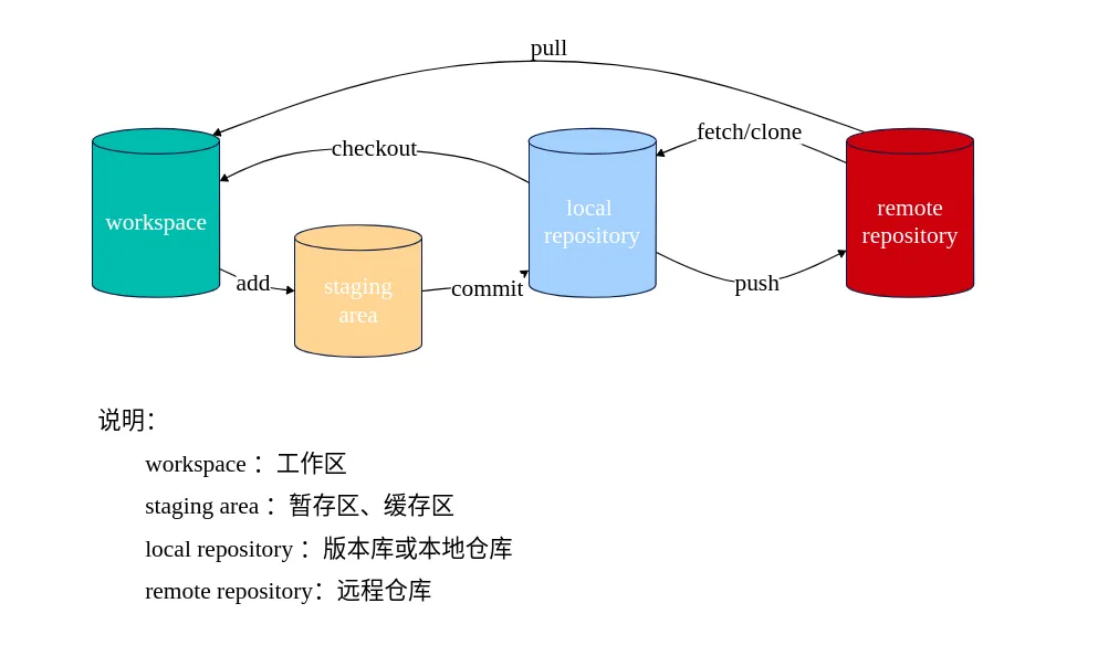 - 图中左侧为工作区,右侧为版本库,版本库中有区域暂存区,标记master的是master分支所代表的目录树。