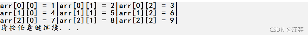 #include<stdio.h> int main(void) { int i, j; int arr[3][3] = { { 1, 2, 3 }, { 4, 5, 6 }, { 7, 8, 9 } }; for (i = 0; i < 3; i++) { for (j = 0; j < 3; j++) { printf("| arr[%d][%d] = %d |", i, j, arr[i][j]); } printf("\n"); } return 0; }